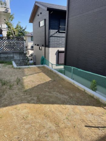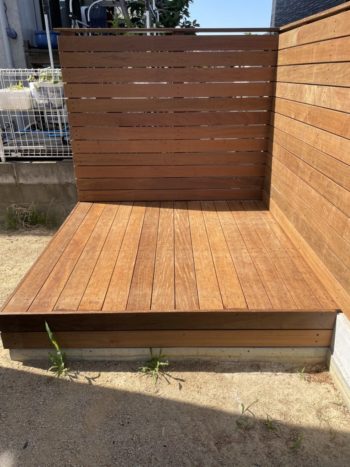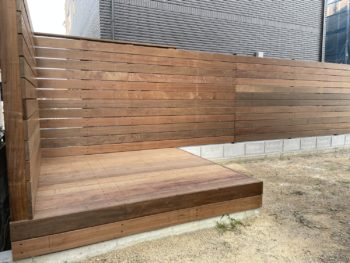 裏庭の隣地との遮蔽のフェンスと角の所のデッドスペースの有効活用のためのデッキ施工。